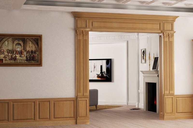 Подобная отделка – неотъемлемый элемент большинства исторических стилей. Для отделки используют древесину дуба, ясеня, сосны, граба. Приобрести детали можно в готовом виде. При монтаже их фиксируют с помощью гвоздей или саморезов.