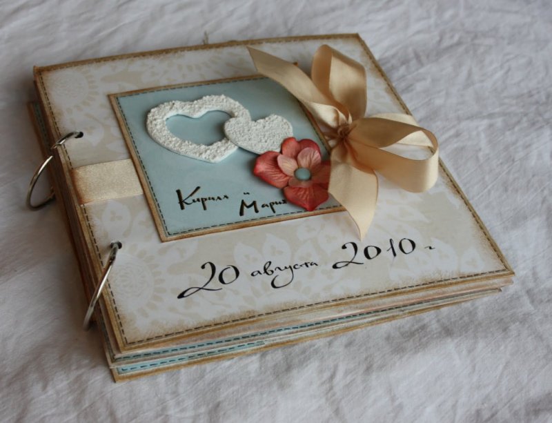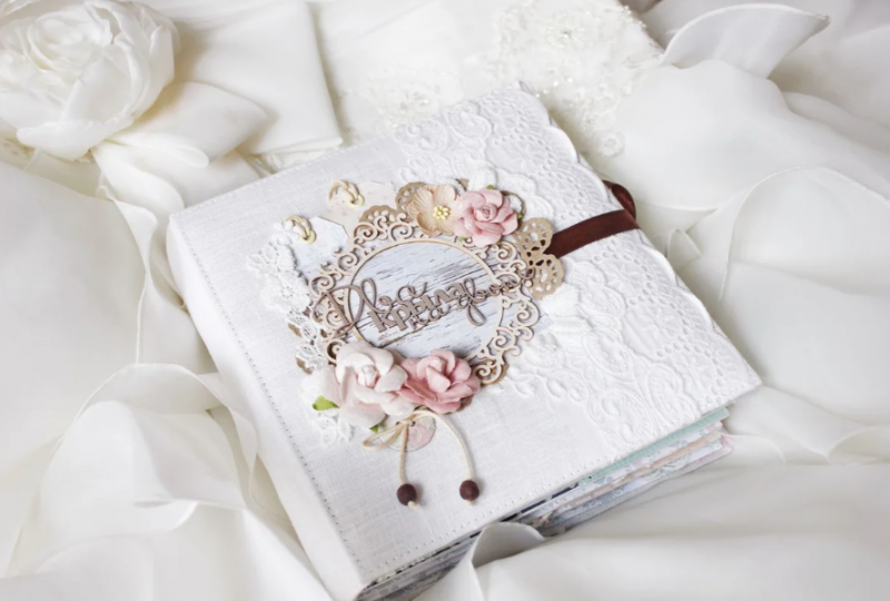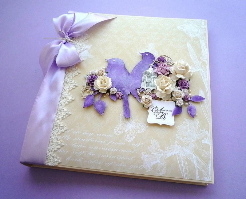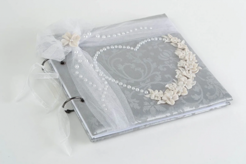 Этот альбом посвящен самому значимому дню для каждой семьи. Рассказ о нем в фотографиях сделает его незабываемым. Для оформления подойдут любые свадебные аксессуары – перчатки невесты, изображения соединенных обручальных колец, цветочных арок, голубей, свадебного торта, бокалов с именами жениха и невесты и датой бракосочетания, букетики, объемные цветы. Для декорирования подойдут кружева, фатин, готовые цветочки и бабочки из органзы, белого креп-сатина, жемчуг, атласные ленты.