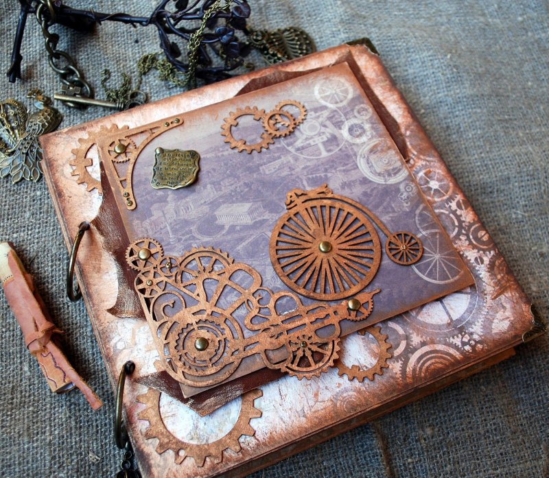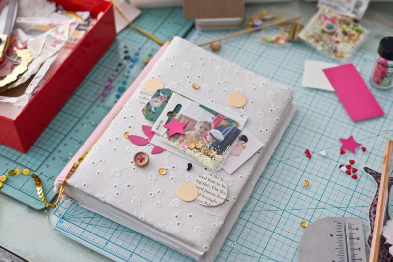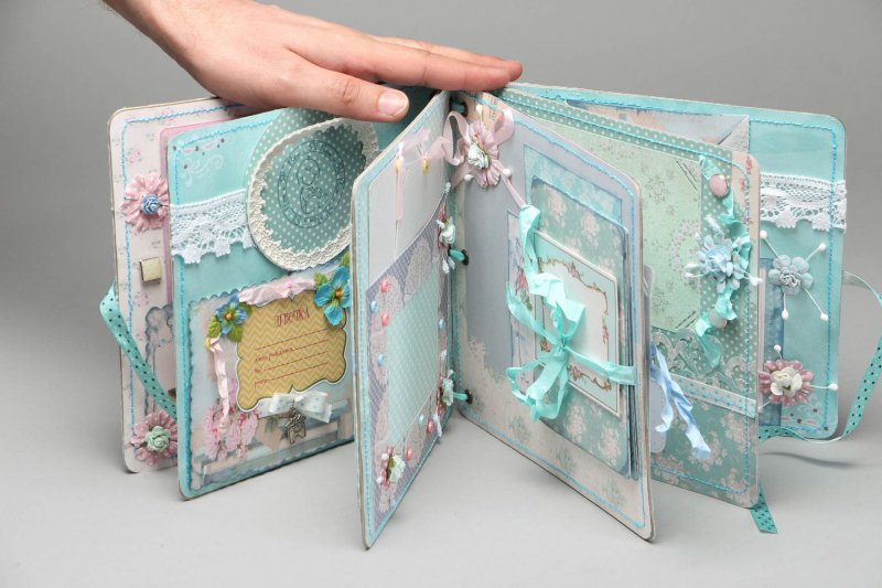 Не ограничивайте свою фантазию и используйте любые подручные материалы, только старайтесь равномерно располагать объемный декор на страницах. Это позволит избежать деформации листов и потери первоначальной формы альбома.