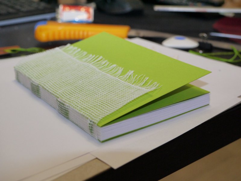 - Загибаем остатки марли и фиксируем их по краю. Так мы одновременно скроем недостатки сборки торца переплета и дополнительно зафиксируем листы, что не позволит им отлететь.