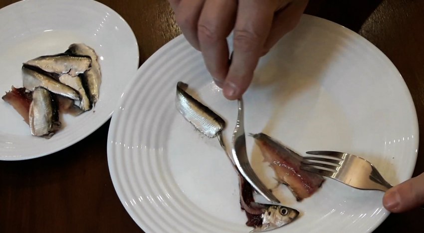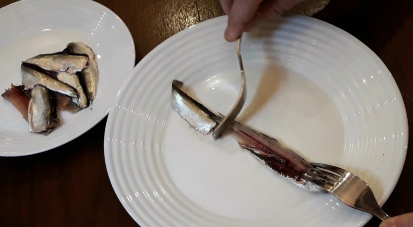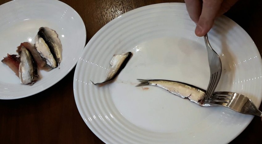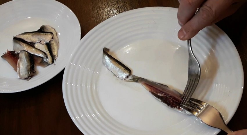 Далее одной вилкой прижимаем головку кильки к тарелке, а другой подрезаем филе до хребта и ведем боковую часть вилки по нему от головы до основания хвоста.
