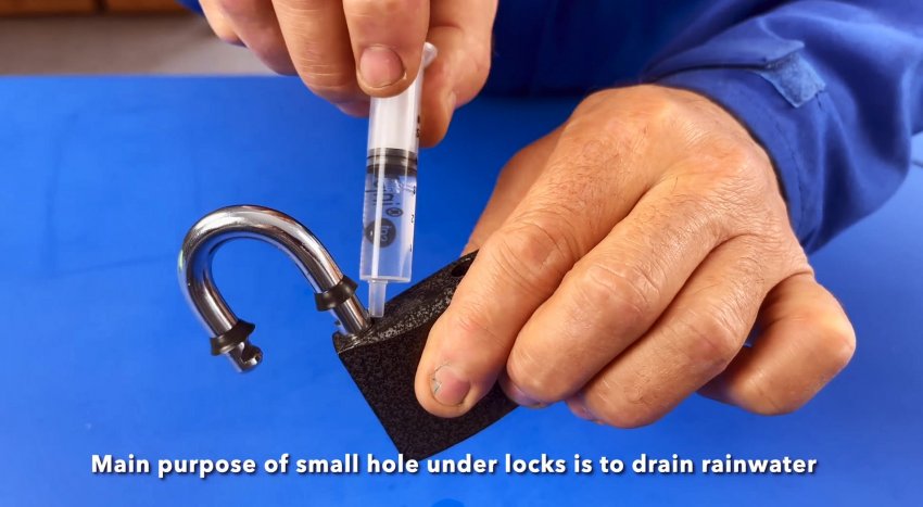 Небольшое отверстие в корпусе висячего замка в основном предназначено для отвода из него дождевой или талой воды.