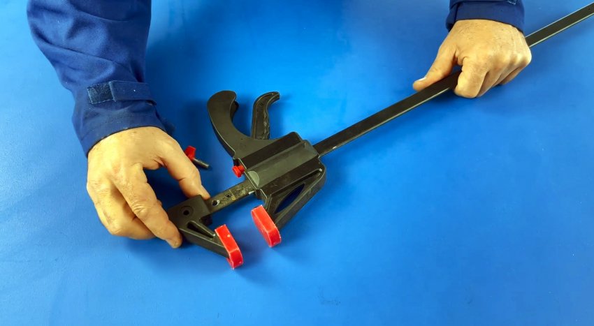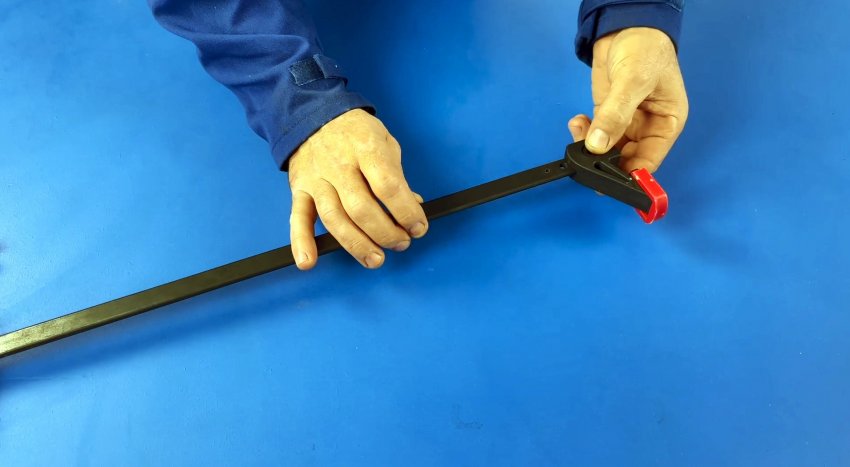 Снимаем неподвижный упор струбцины с силовой планки и укрепляем ее на другом конце так, чтобы упор был направлен наружу. Перемещаем подвижный упор к неподвижному и получаем полноценный подъемник.
