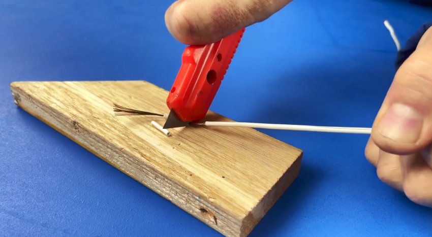 Многим людям непонятна выемка на переднем конце обуха лезвия канцелярского ножа. Одна из ее функций заключается в удалении с проводов надрезанной или целой изоляции при зачистке проводов.