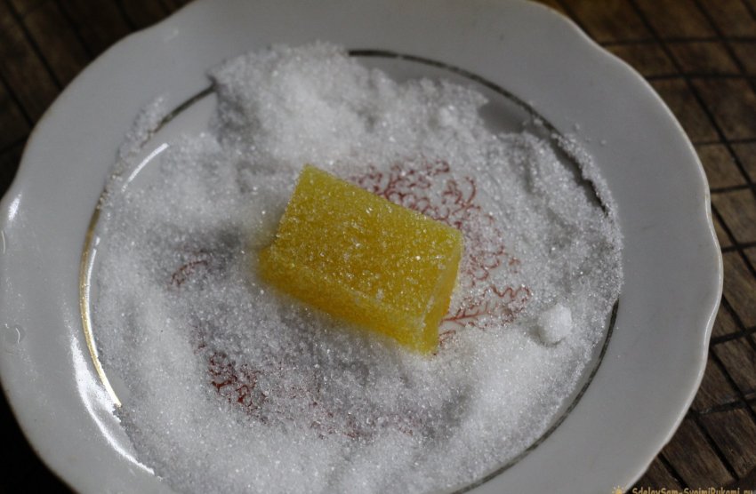 4. Нарезать мармеладки на произвольные кусочки. Каждый кусочек обвалять в обычном сахаре-песке или же в стружке кокоса.