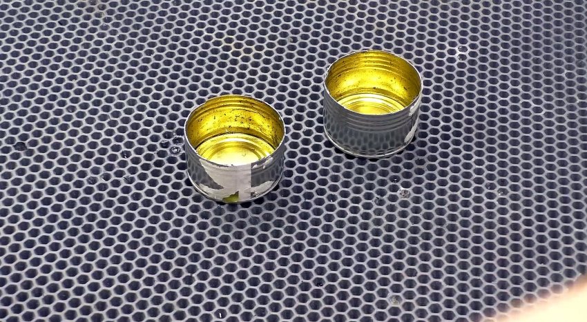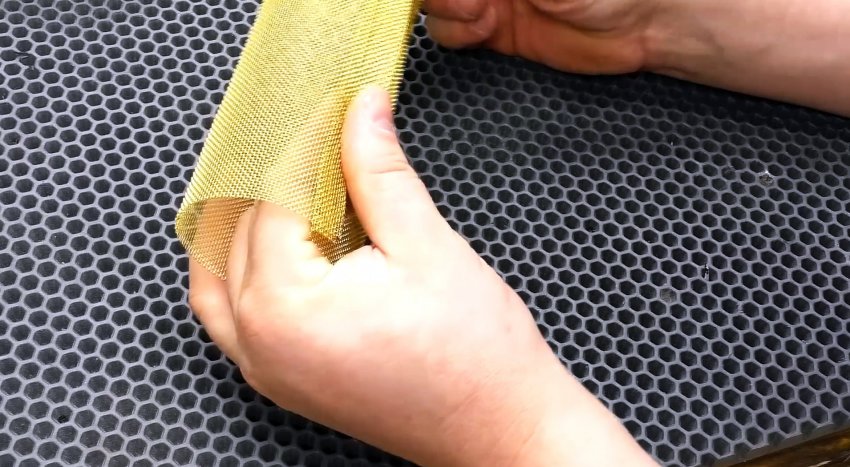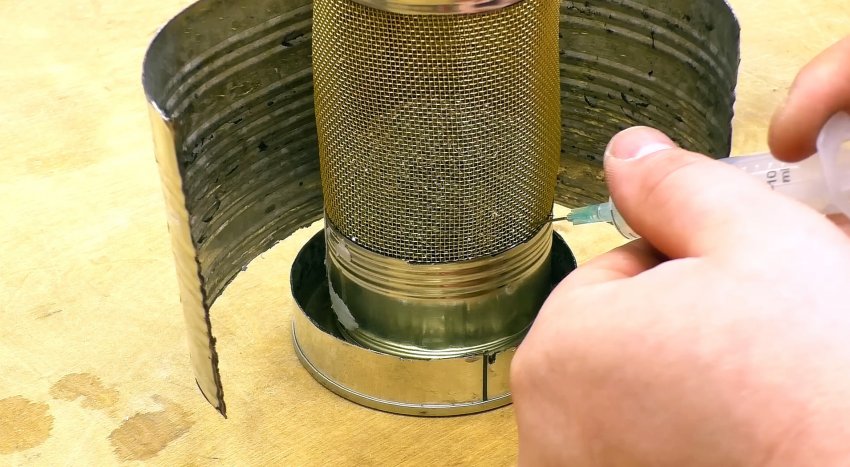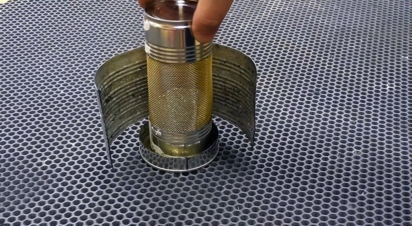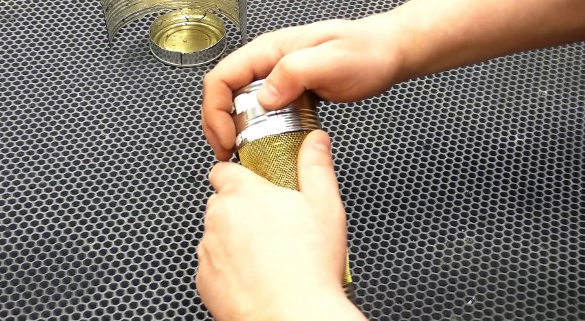 Мелкой металлической сеткой для ремонта бамперов оборачиваем банку, намечаем место отреза, добавляем 1 см, отрезаем и за счет него делаем замок, который после сворачивания сетки в рулон защелкиваем.