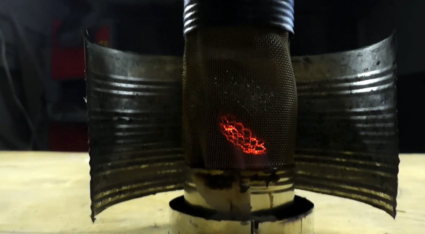 Поджигаем зажигалкой снаружи сетки пары спирта и ждем пока наш самодельный камин выйдет на рабочий режим. Он наступает тогда, когда горящие пары спирта раскалят до красна ленточки металлической губки.
