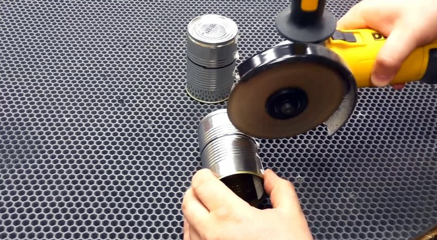 Удаляем с банок этикетки и снимаем крышки. Наносим разметку примерно на расстоянии 3 см от дна банки и отрезаем болгаркой.
