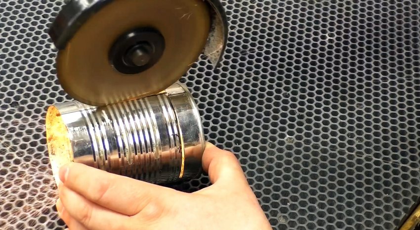 Для дальнейшего шага нам понадобится банка несколько больше предыдущих. Отрезаем болгаркой верхнее круговое ребро жесткости. Отступив от дна примерно 3 см, разрезаем банку в поперечном направлении примерно до середины. Затем выполняем продольный разрез от верха банки до центра поперечного разреза и несколько разгибаем полученные боковины продольного разреза.