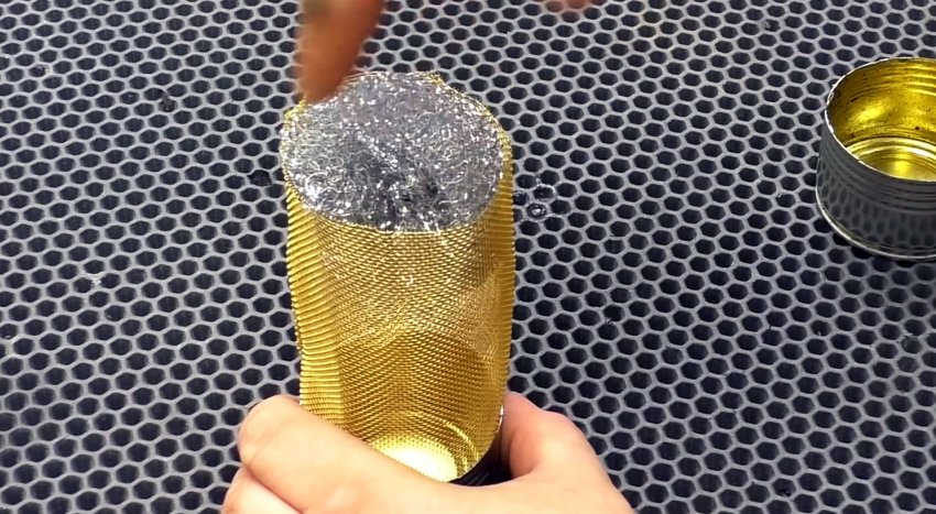 Биокамин собираем в следующей последовательности: сетчатый рулон вставляем в донную часть меньшей банки. Внутрь рулона помещаем металлическую губку для удаления сильных загрязнений и сверху закрываем донышком второй банки.