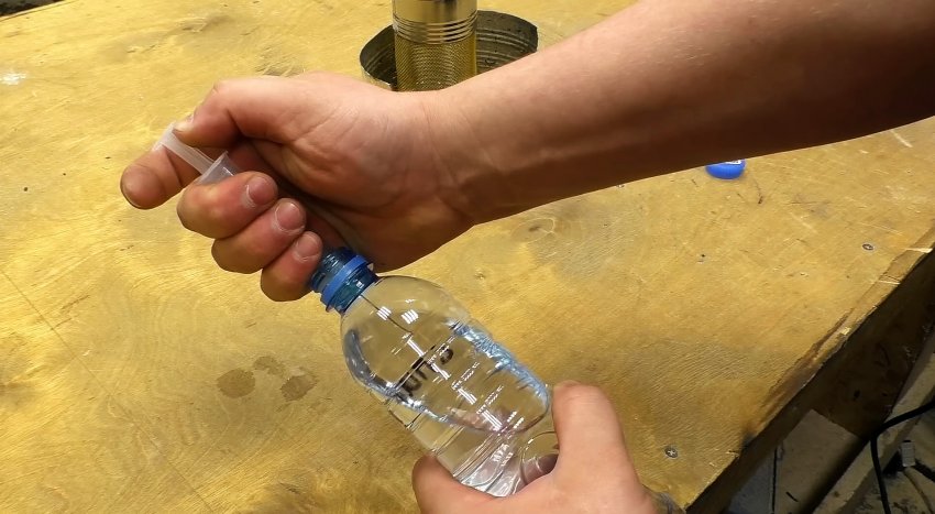 Заправлять наш биокамин удобнее с помощью медицинского шприца, набирая через иголку из емкости, и заливая в нижнее донце меньшей банки.