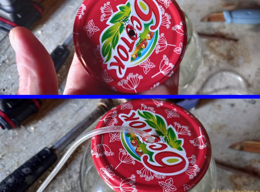 Выводим конец инфузионной трубки в отверстие в крышке банки.