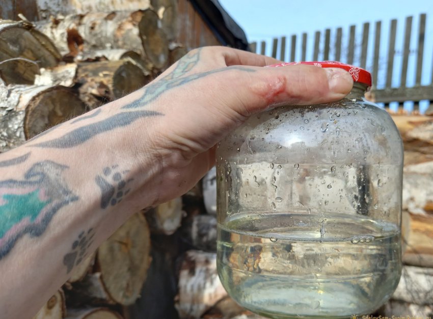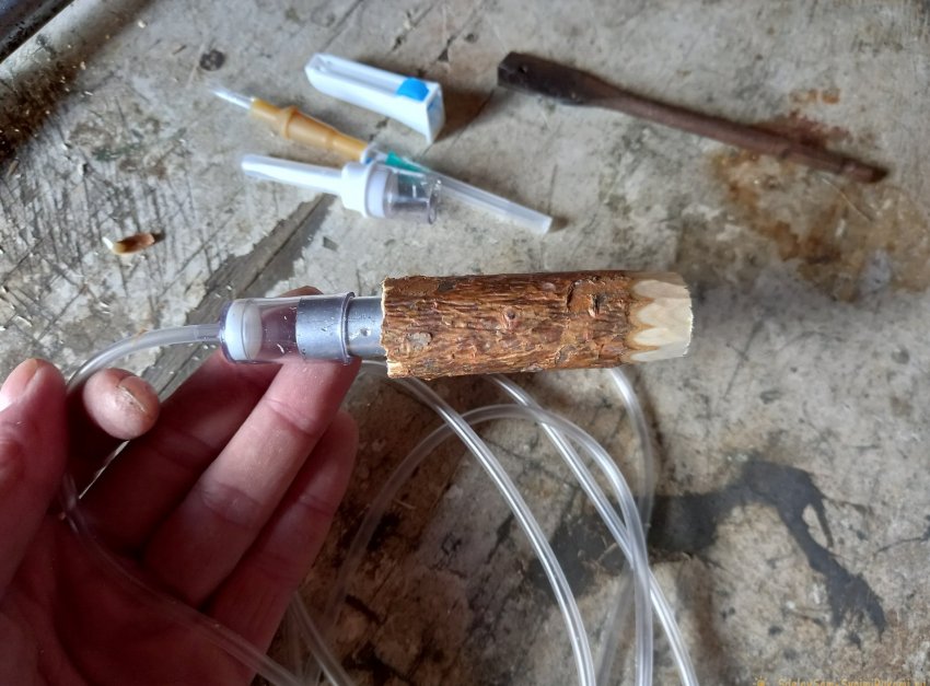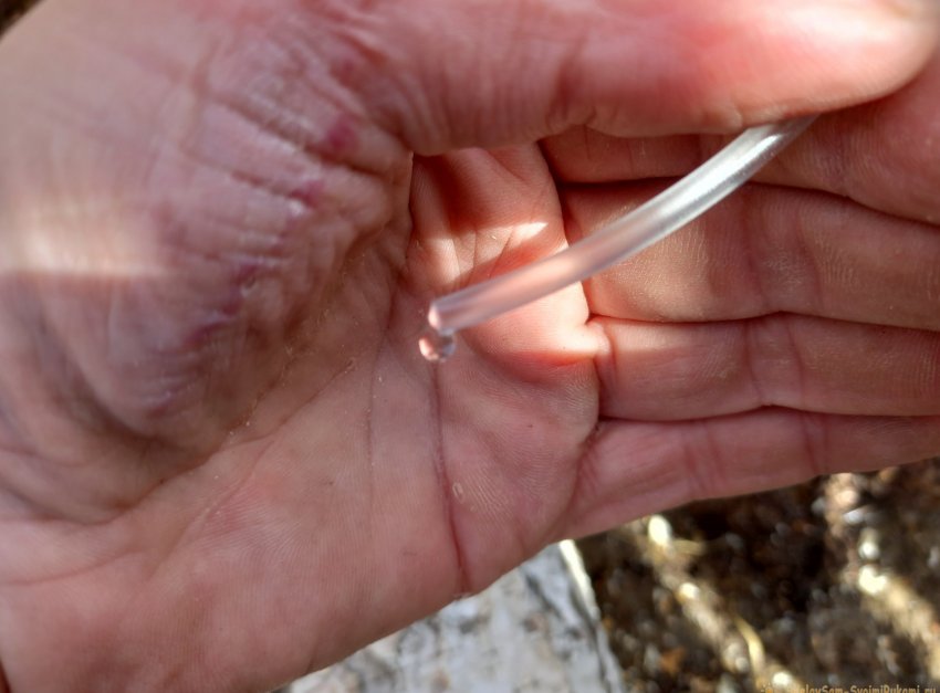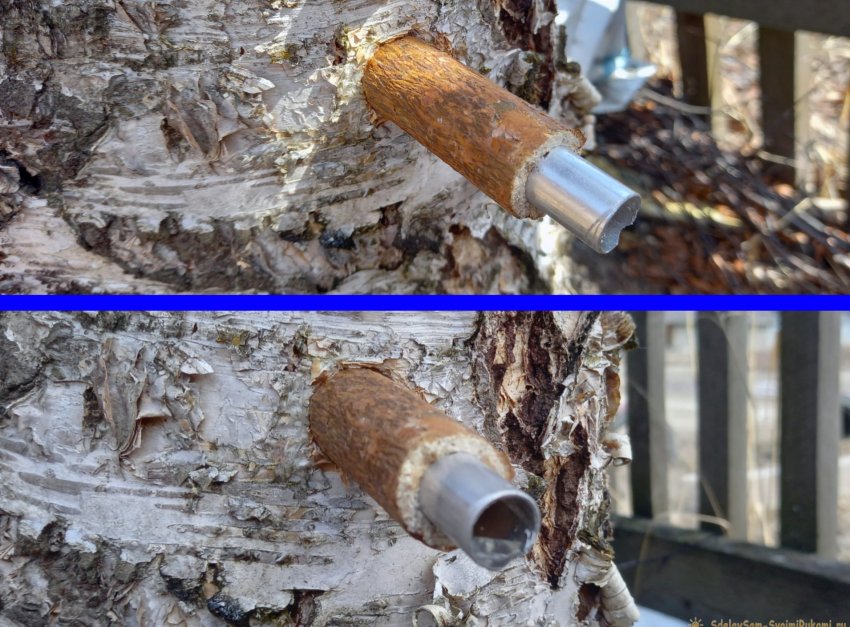 Устанавливать напрямую металлическую трубку в ствол дерева, минуя стадию возни с чопиком, не стоит – она все время будет вываливаться; древесина от влаги разбухнет, и просто выдавит трубку. Осталось подождать, пока наполнится банка, и потом насладиться свежим витаминным напитком. Днем сок течет довольно резво.