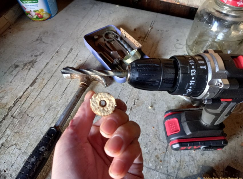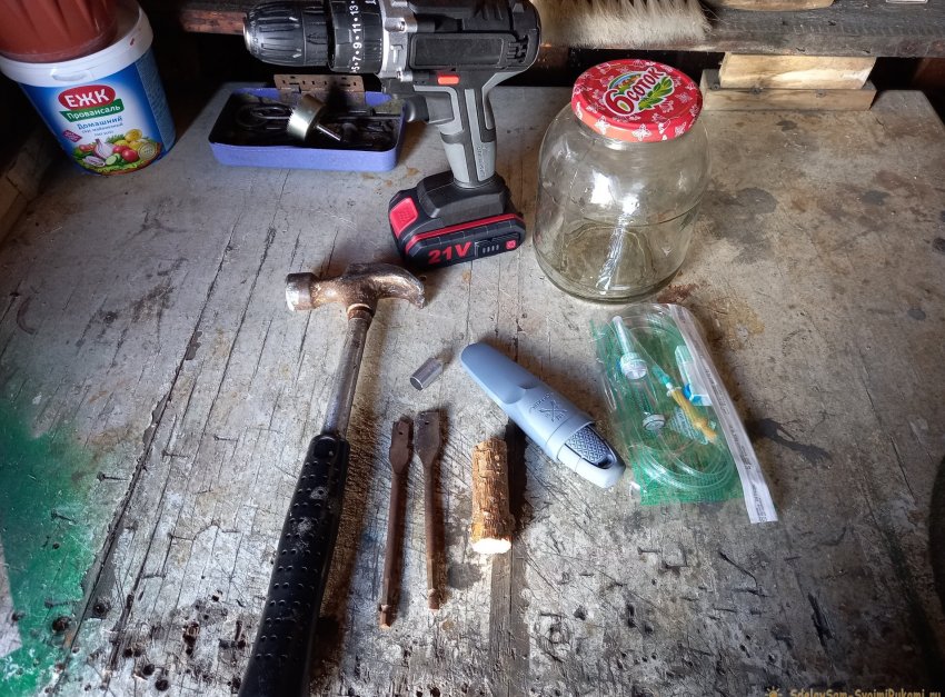 Крышка нужна, чтобы в банку с соком не лезли мухи, муравьи, и прочие любители глюкозы. На том подготовка материала закончена, и пора приступать к установке. При помощи дрели и пера на 20 мм, делаем в стволе углубление около 3см глубиной.