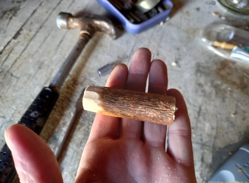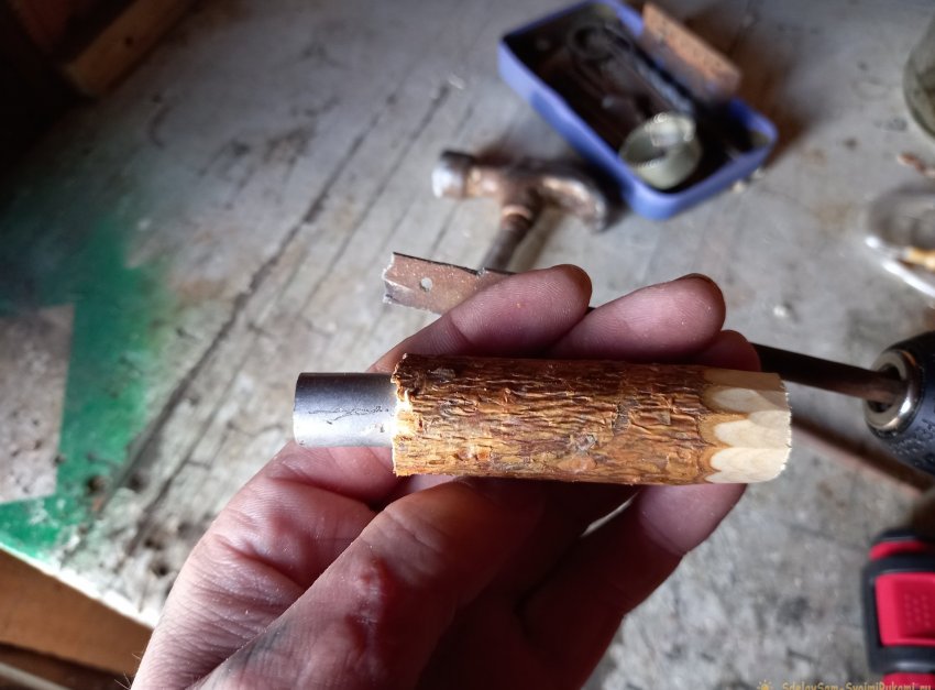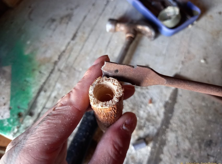 Это может быть любой сук, или отрезок черенка, диаметром не меньше 20 мм. Если диаметр окажется немного крупнее, это не страшно, можно довести его ножом до нужного размера. Сверлим его насквозь, вдоль, сверлом на 5-7 мм.