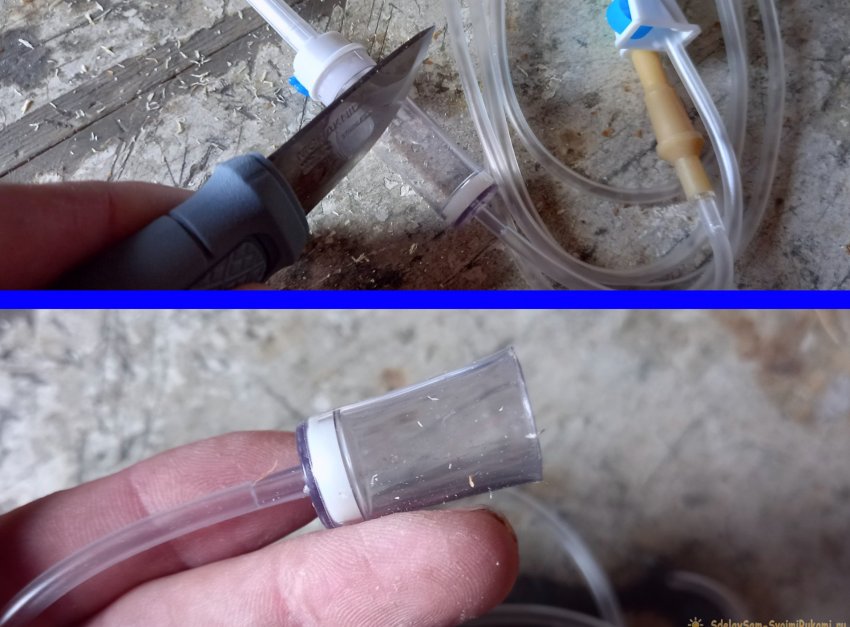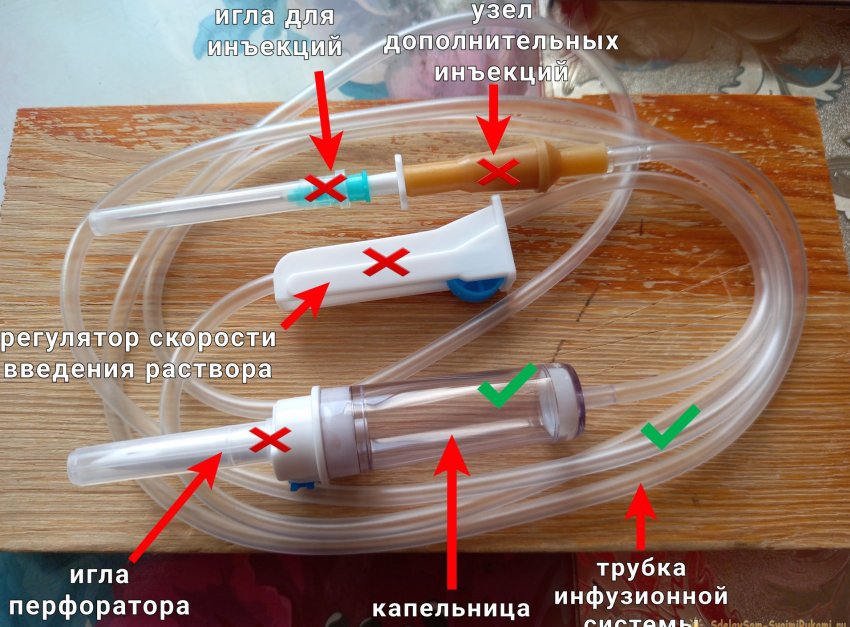 Теперь подготовим капельницу. Точнее, отдельные её части. Нам понадобится только гибкая трубка и сама капельница – полиэтиленовая колба, в которой капает раствор.