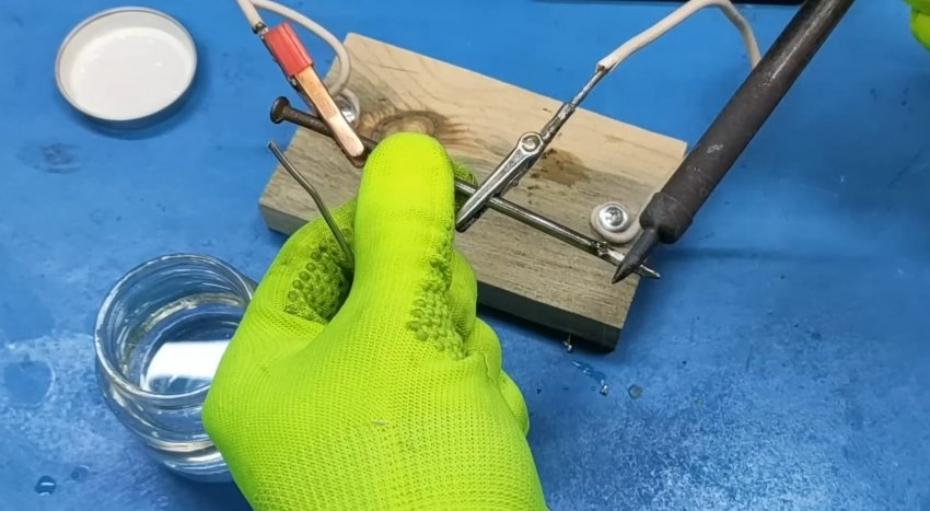Обычный гвоздь облудить с помощью канифольных флюсов не получится. А если опустить его в раствор лимонной кислоты буквально на несколько секунд, то припаять к нему, например, медный провод, не составит труда. Припой хорошо ложится на гвоздь, побывавший в нашем самодельном активном флюсе. Пайка качественная и надёжная.
