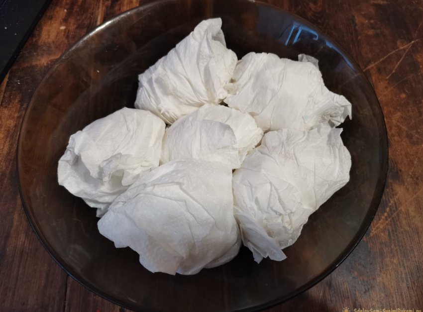 Заранее отварите яйца до готовности (вкрутую). Можно работать с горячим продуктом или его остудить. Обмотайте каждое яйцо бумажными салфетками или полотенцами. Необязательно делать это аккуратно, можете даже специально сминать бумагу.