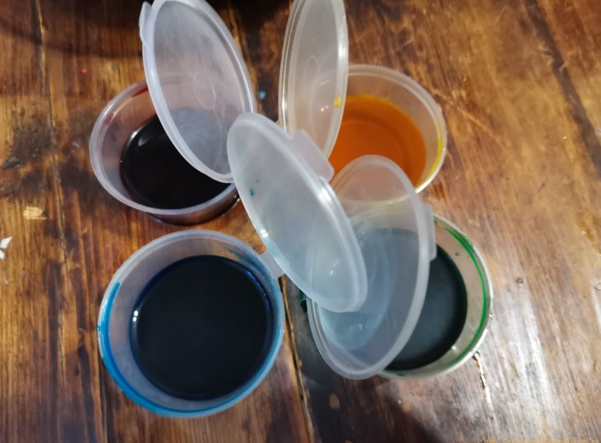 В отдельные емкости насыпьте пищевой краситель. У меня было четыре основных цвета из набора – желтый, красный, синий и зеленый.