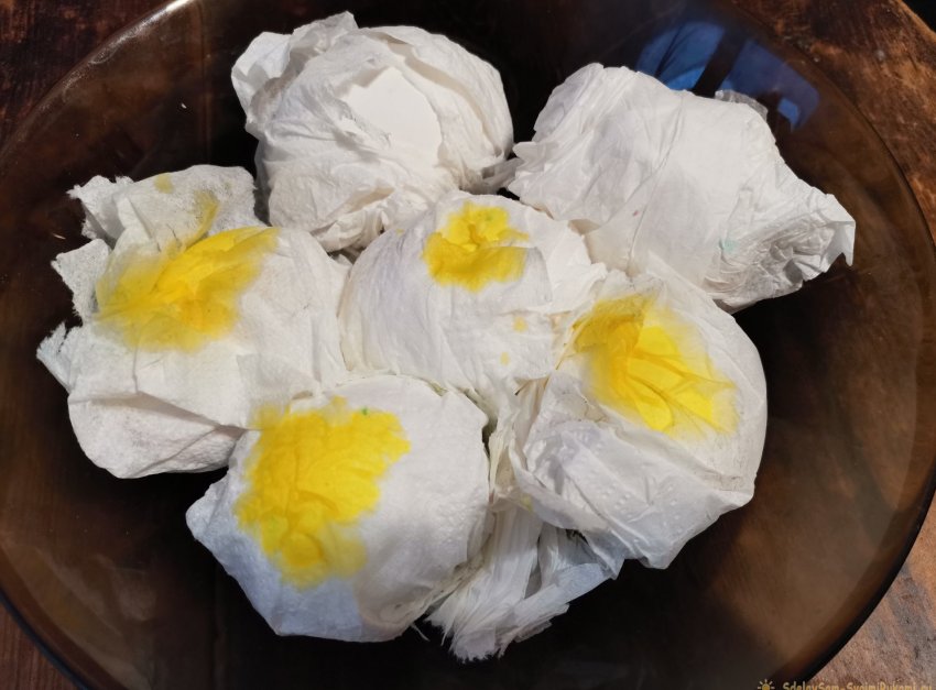 Ватную палочку обмокните в цветной раствор и в некоторых местах, в хаотичном порядке, покрасьте салфетки. Начинайте с более светлого цвета – у меня это желтый.