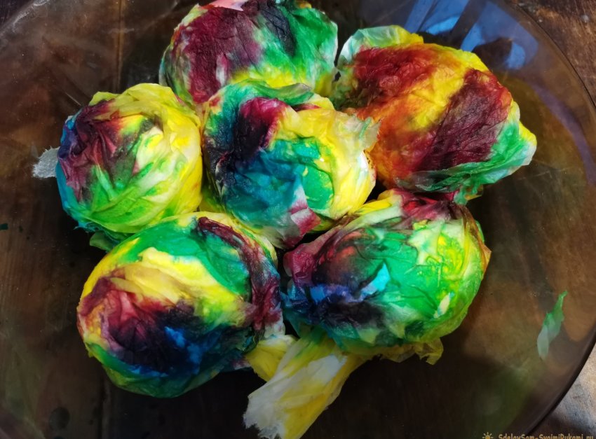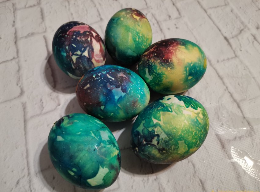 Оставьте яйца в цветных салфетках на 20-30 минут. Можете иногда добавлять краску. Через положенное время снимите бумагу, протрите каждую штучку растительным маслом для закрепления цвета и появления блеска. Разложите на ровной поверхности для высыхания.