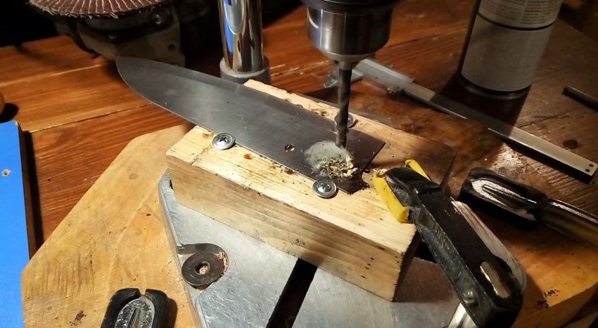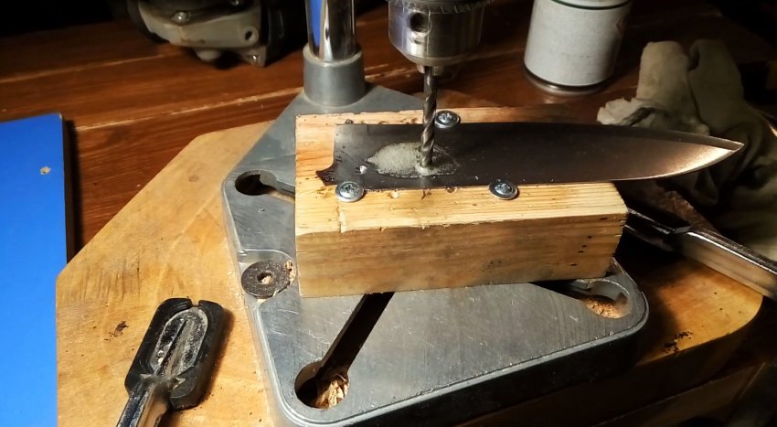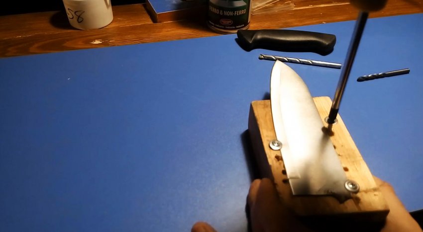 Для удобства сверления закрепляем клинок ножа к деревянному бруску с помощью трех шурупов, шляпки которых и будут удерживать обрабатываемую сталь.