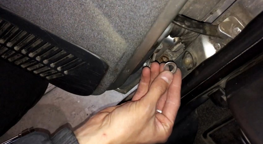 В первом случае дефект устраняем применяя вороток, удлинитель, головку №13 и обыкновенную круглую шайбу соответствующей толщины. Для этого коленом подпираем снизу наружный угол дверцы, предотвращая этим ее смещение при ослаблении и откручивании болтов петли.