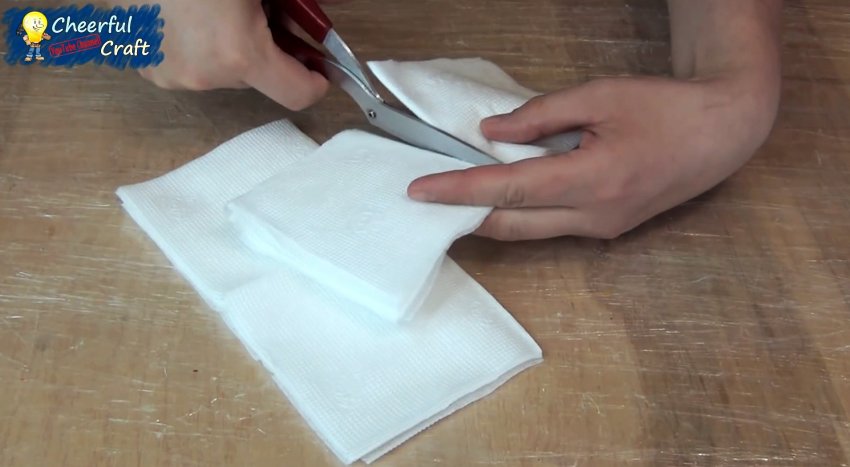 Начинаем приготовление с бумажных салфеток, которые разворачиваем, разрезаем ножницами по линиям сгиба на четвертинки и по одной укладываем в клей ПВА, заранее налитый в подходящую по вместимости емкость, постоянно перемешивая содержимое ложкой.