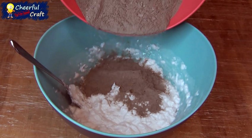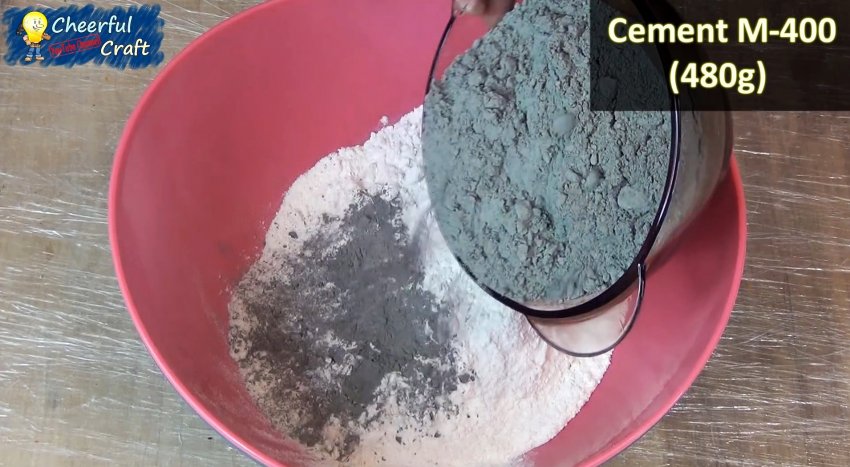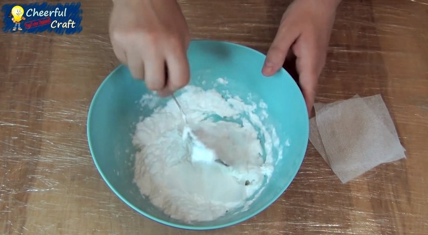 В отдельную емкость засыпаем пшеничную муку, затем цемент и тщательно перемешиваем до получения гомогенной смеси, которую после этого всыпаем в емкость с клеем ПВА с растворенными бумажными салфетками.