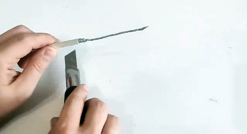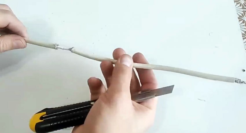 И вот на этом двухсантиметровом участке кабеля снова снимается верхний слой винила и экранирующая оплётка. Остаётся центральная жила в изоляции.