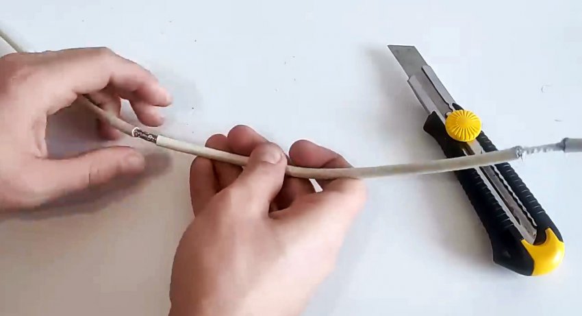 Важно не повредить экранную оплётку. Её нужно аккуратно расплести, а затем снять с сигнальной центральной жилы изоляцию на те же 8 см.