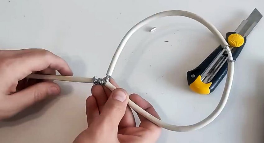 Именно этот сегмент экрана должен быть надежно соединён с восьмисантиметровым концом провода, подготовленным в самом начале. Плотно накручивается несколькими витками. В итоге получается круг, от которого отходит кабель снижения к телевизору.