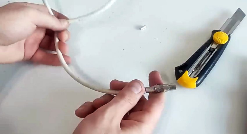 Снимается верхняя виниловая оболочка на расстояние около 1 см. Экранирующая оплетка расплетается и загибается далее на кабель. Изоляция с сигнального провода удаляется не на всю длину, а не доходя 2-5 мм до края снятой верхней изоляции. Это необходимо, чтобы экран и сигнальный провод не замкнулись между собой при монтаже разъёма. Сам штекер состоит из двух частей: F-разъёма и переходника. На кабель и загнутую оплётку накручивается разъём. Он имеет резьбу, и сделать это очень легко. Перед этой операцией следует приложить его к разделанному участку провода, возможно, придётся подкорректировать длину центрального проводника, отрезав лишнее. И теперь осталось вкрутить выбранный F-переходник. Они бывают прямые и угловые. Выбирается тот, который удобнее встанет в антенное гнездо телевизора. Всё, антенна готова.