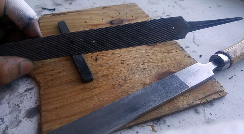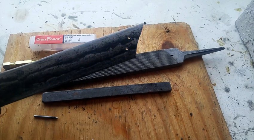 Для сохранности сверла лучше воспользоваться сверлильным станком, чтобы минимизировать люфты, и обязательно применять при сверлении масло. В результате сверления выяснилось, что металл напильника оказался тверже, чем инструментальная сталь, из которой сделан клинок ножа.