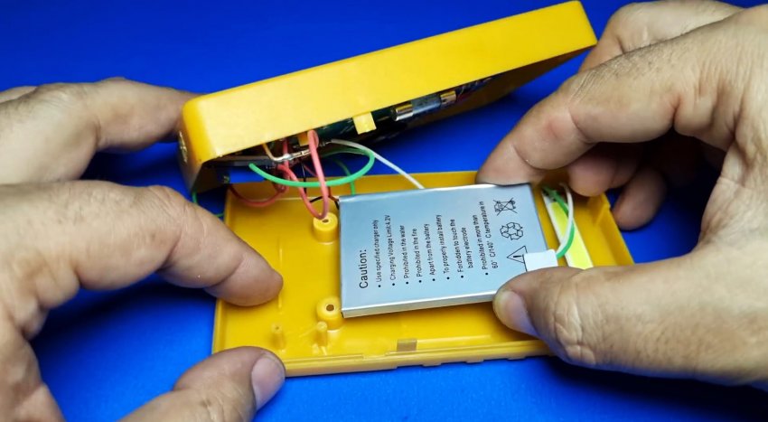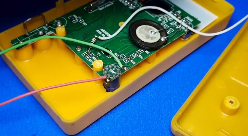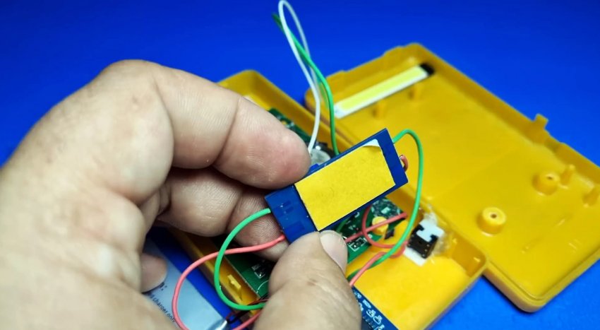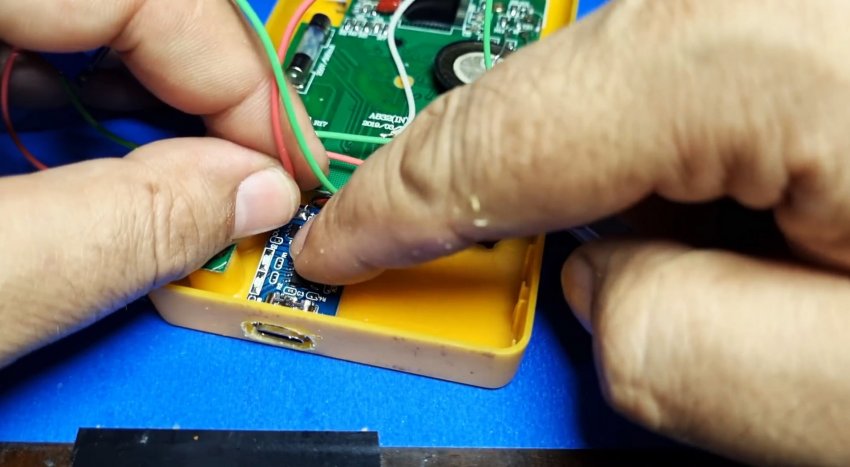 В этом нам помогает двусторонний скотч и термоклей. Следим, чтобы ничего не замкнуть, при необходимости подкладываем изоляционную ленту. Закрываем мультиметр. Проверка.