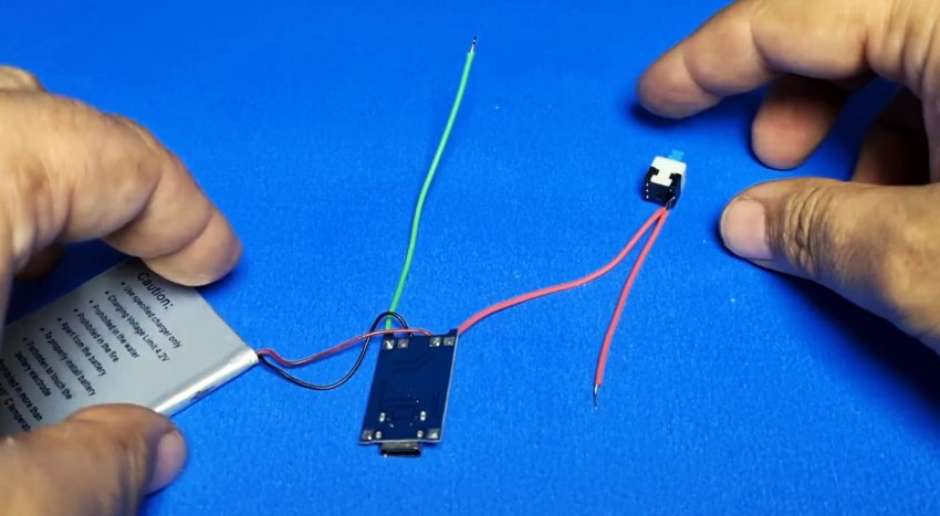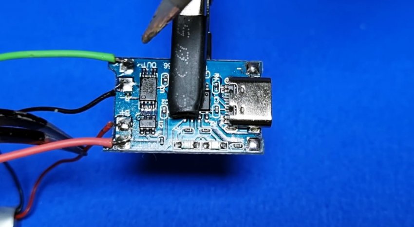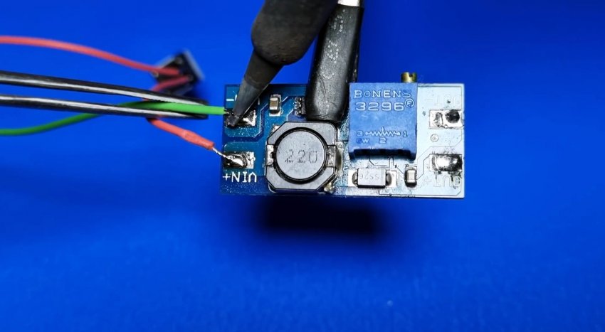 Абсолютно все точки подключения подписаны на платах. Очень сложно ошибиться. Припаиваем к зарядному модулю провода выхода питания (out+/out-) и аккумуляторной батареи (В+/В-).
