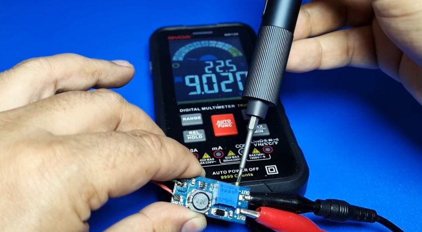 Регулировка выходного напряжения осуществляется прецизионным многооборотным потенциометром. Распаиваем провода согласно надписям на печатной плате. Включаем наше собранное устройство и выставляем выходное напряжение 9 В.