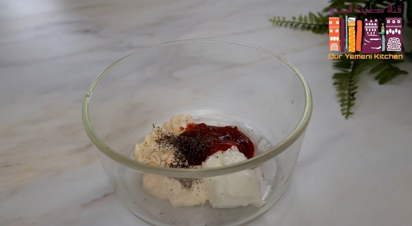 2 ст. л. покупного майонеза смешиваем с 1 ст. л. жирного йогурта, 1 ст. л. кетчупа и 0,5 ст. л. уксуса. Добавляем немного черного перца, все перемешиваем и взбиваем венчиком. Оставляем в холодильнике на 10-15 минут.