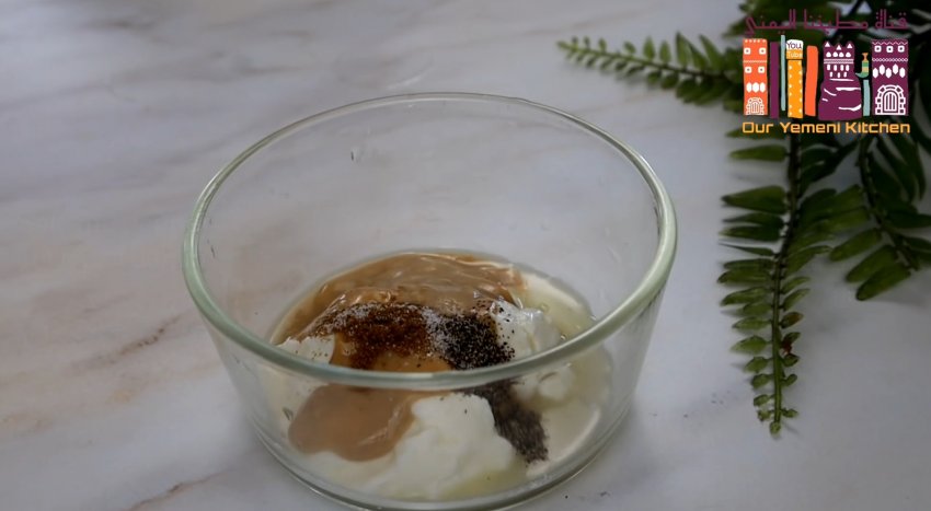 3 ст. л. йогурта смешиваем с 1 ст. л. соуса тахини (или молотого кунжутного семени), 1 ч. л. лимонного соуса. Солим, добавляем немного сухого черного перца, тмина, 2 ст. л. воды. Все хорошо взбиваем венчиком или блендером.