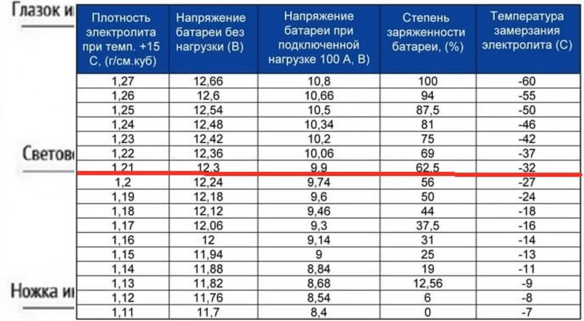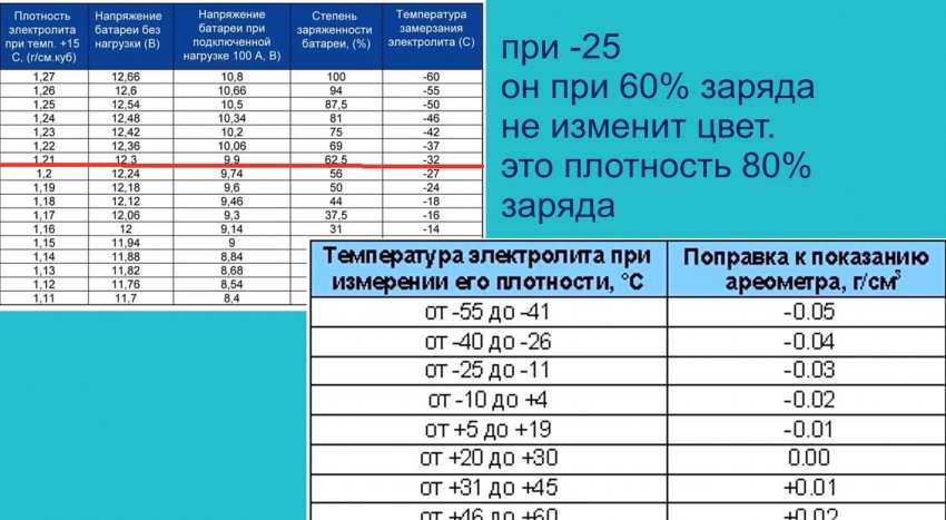 Плотность также зависит и от температуры окружающей среды. И на холоде раствор в банках становится более густым, его концентрация повышается. Индикатор при этом горит «зелёным глазом», сигнализируя, что всё в норме. Но, на самом деле, аккумулятор оказывается разряженным.