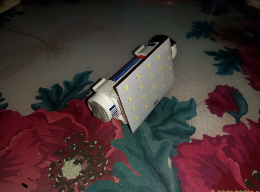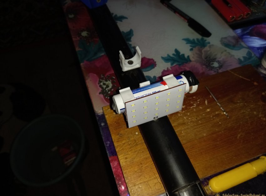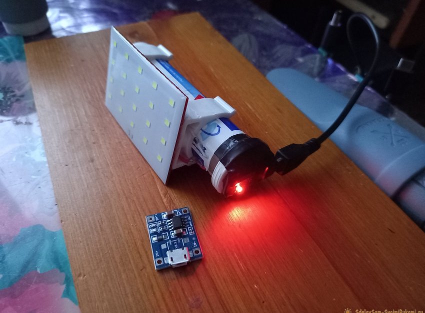 Припаиваем проводку, заталкиваем аккумулятор в любой подходящий корпус, приклеиваем с торцов выключатель и модуль зарядки, приклеиваем к диодной панели ещё пару клипс, и крепим к корпусу.