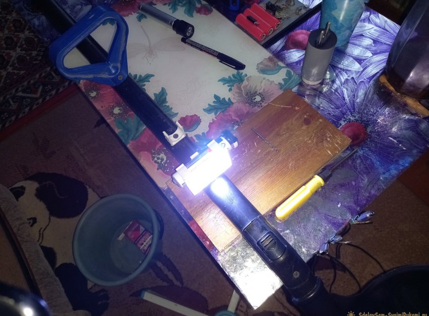 А теперь можно и испытать. Выходим на улицу, крепим фонарик на клипс черенка, включаем фонарик (если на улице темно), и пробуем работать.