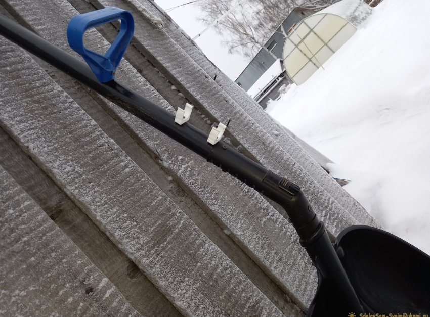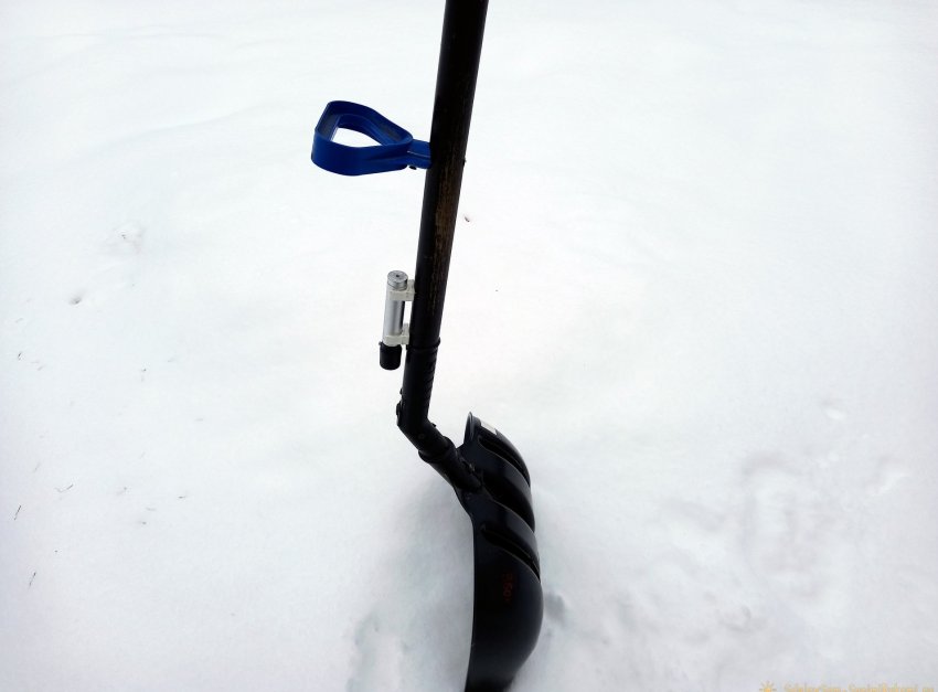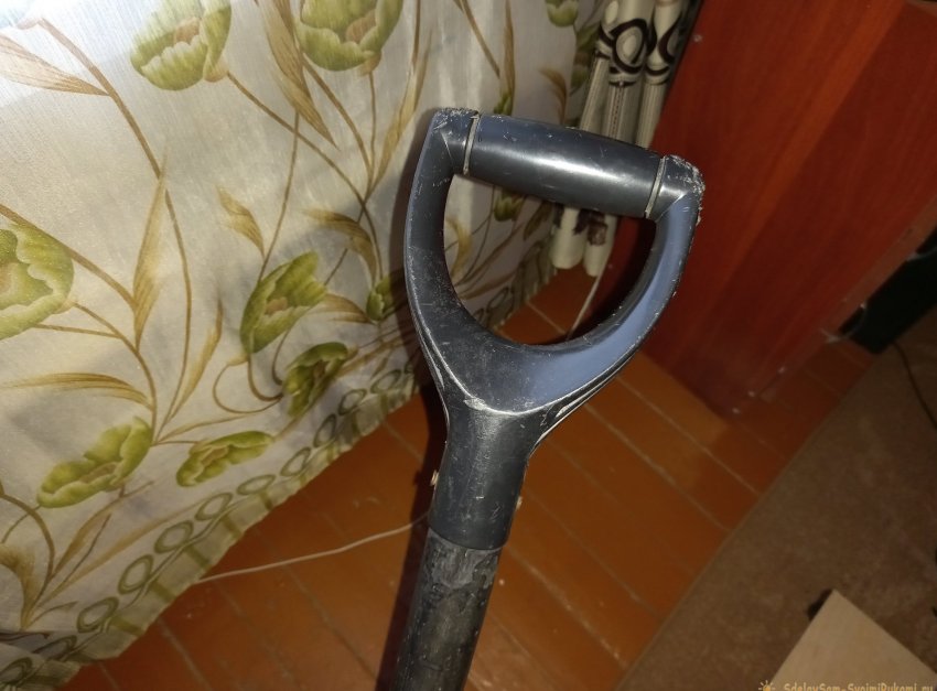 С таким углом наклона, захват снега в лопату гораздо больше, а нагрузка на плечи и спину уменьшается в разы. Ну, а чтобы уменьшить нагрузку ещё и на предплечья, мы приделаем к черенку ещё одну рукоятку. Одна рукоятка (если у Вас их на лопате вообще не было), устанавливается на окончание черенка и крепится саморезом.
