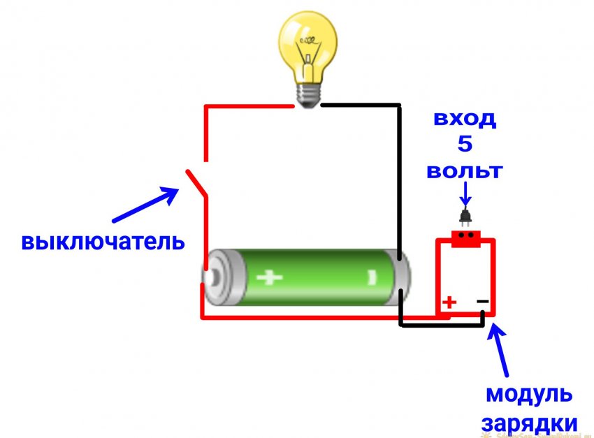 Мой фонарик, работающий от зарядного устройства (которое так же исполняло роль рукоятки фонарика), оказался для такой работы не очень удобен – слишком уж у него узконаправленный луч, рассчитанный на дальние расстояния. А зума нет. Но никогда недолго быстренько спаять светильник с нужной направленностью света. Для этого понадобится небольшая светодиодная панель с диапазоном потребления от 3 до 6 вольт, аккумулятор 18650 на 3,7-4,2 вольт, выключатель, и модуль зарядки. Ну, а спаять все составляющие в нужном порядке, я думаю, сможет любой. На всякий случай вот схема: