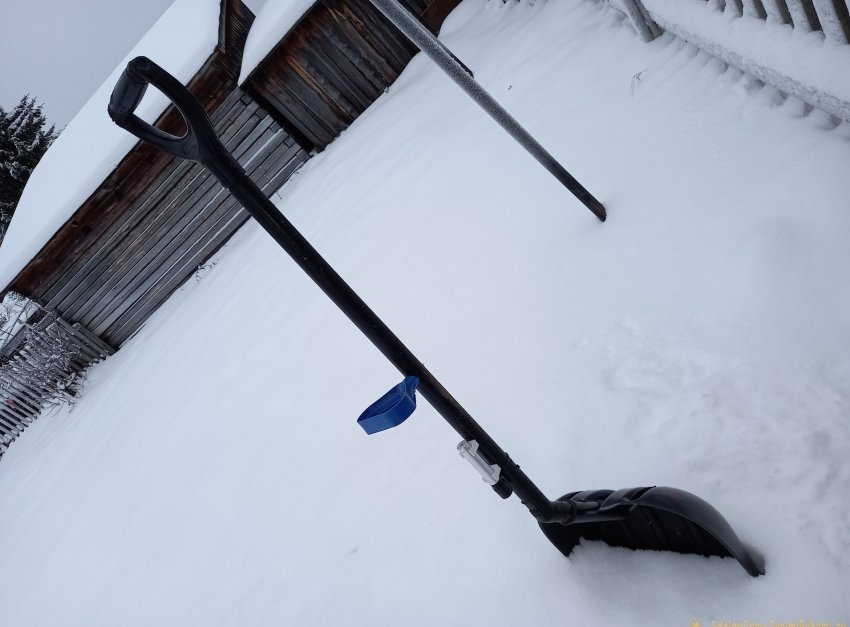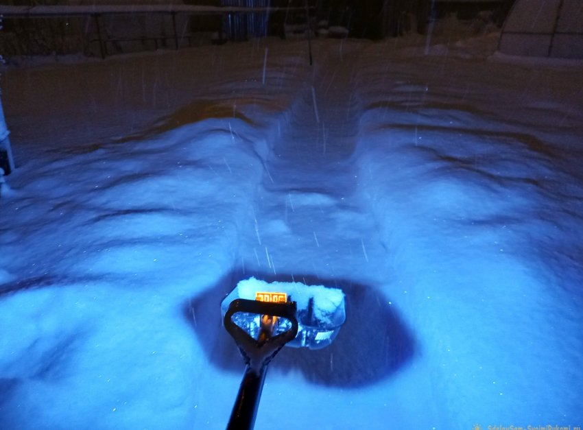 Если Вы живёте в каком-нибудь северном регионе, где зима длится полгода, где зимой световой день составляет 4-5 часов, а снег сыплет с редкими перерывами, то этот полезный совет для Вас! Утром, до ухода на работу, убрать снег с тротуара на своём участке, после снежной ночи, задача из разряда «миссия невыполнима»! Темень, хоть глаз выколи. Сначала я пользовался налобным фонариком, но для меня это не очень удобно, так как капюшон, перекрывает светоотражатель фонарика. А без капюшона в пургу на улице нечего делать. Потому, решил несколько модернизировать свою новую лопату, дабы облегчить себе работу, как в плане освещения, так и в плане уменьшения физической нагрузки на спину.
