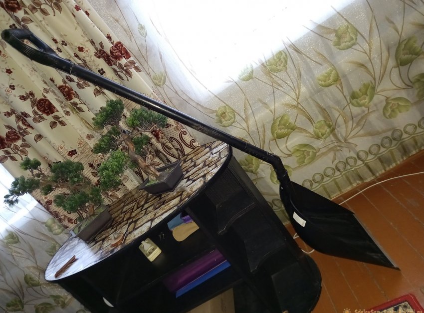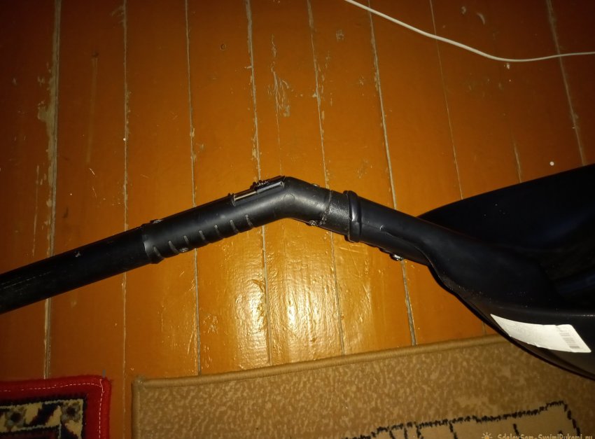 Решил, что лучше пустить в дело его, нежели покупать сантехнический. Такой отвод от пылесоса найдётся не у каждого, потому и предлагаю купить идентичный по наклону и диаметру, сантехнический. Итак, отступаем от того места, где черенок стыкуется с лопатой на 6-7 см, и отпиливаем ножовкой. Вставляем оба отрезанных конца в полу-отвод, и фиксируем на два-три десятимиллиметровых самореза с каждой стороны. Вот что получится: