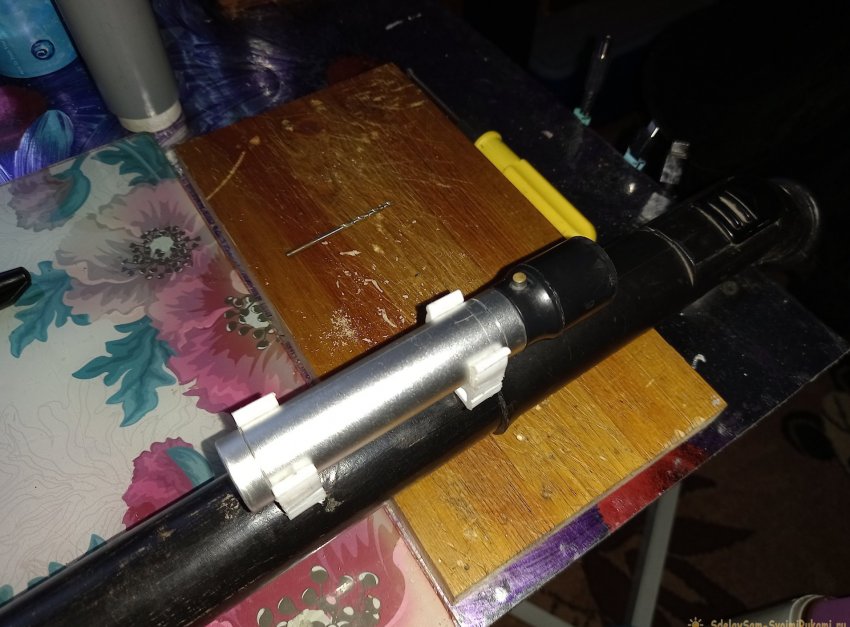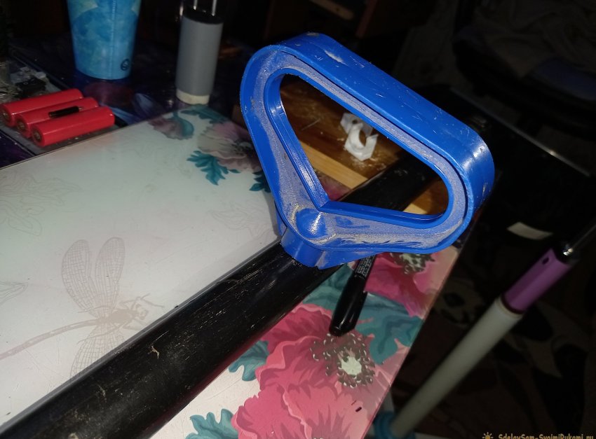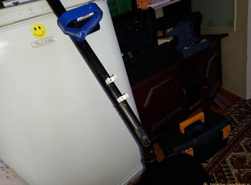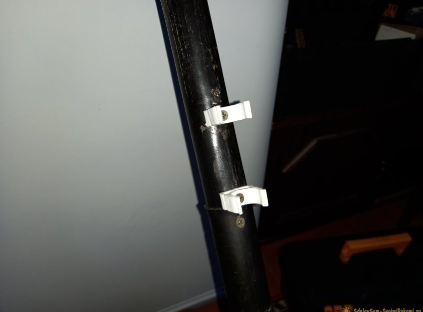 С такой конструкцией основная нагрузка приходится на трицепс, бицепс и пресс, оставляя минимальную нагрузку на поясницу. Теперь позаботимся о зрении. Точнее, об освещении в тёмное время суток. Тут всё проще некуда. Нужно просто вкрутить в черенок, сразу после отвода, пару клипс для водопроводных труб, на расстоянии в 6-8см друг от друга. Внутренний диаметр клипс должен соответствовать диаметру Вашего фонарика.