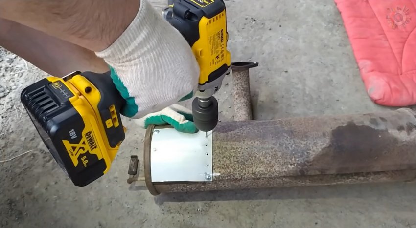 Из остатков жестяного листа, толщина которого составляет 0,8 мм, отделяем подходящую по размеру заплатку, накладываем на поверхность глушителя в прогоревшем месте, сгибаем, закрепляем на противоположных углах и выполняем по периметру систему отверстий для закручивания саморезов.
