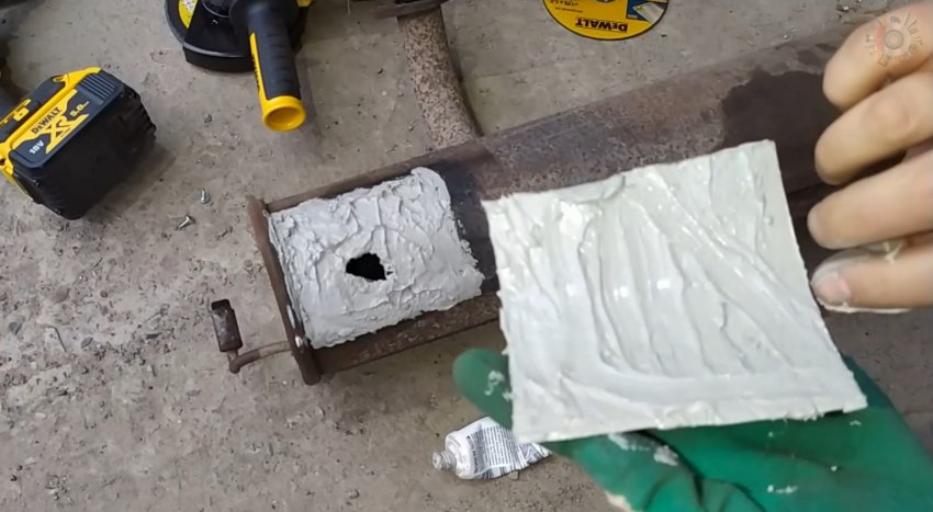 Зачищаем поверхность глушителя под латкой с помощью болгарки с соответствующим диском. На нижнюю сторону заплатки наносим керамический герметик для ремонта и монтажа выхлопных систем. Для надежности наносим герметик и на поверхность глушителя.