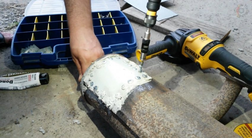 Пока герметик не схватился, прижимаем заплатку к поврежденному месту и вкручиваем саморезы.